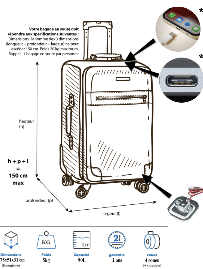 - Localisez le port USB-C situé sur le côté ou sur la poignée de votre valise.